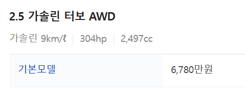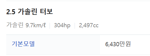 * 가솔린 2.5 터보 엔진 : 최고출력 304ps, 최대토크 43.0 kgf.m