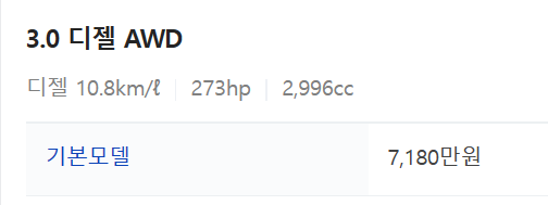 * 디젤 3.0 엔진 : 최고출력 273ps, 최대토크 60.0 kgf.m