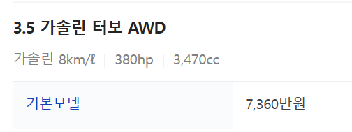 * 가솔린 3.5 터보 엔진 : 최고출력 380ps, 최대토크 54.0 kgf.m