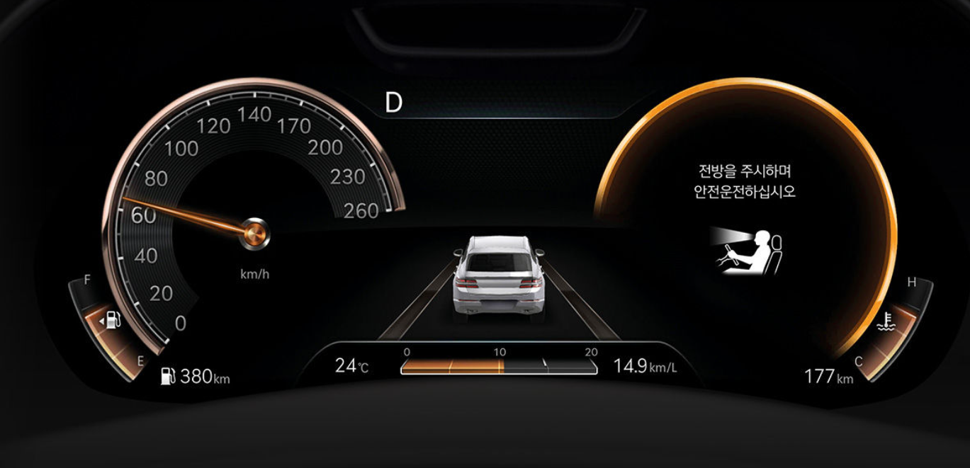 - 만약 운전자가 전방을 주시하지 않고 있다고 판단되면 클러스터에 경고를 표시하고 경고음이 울립니다.