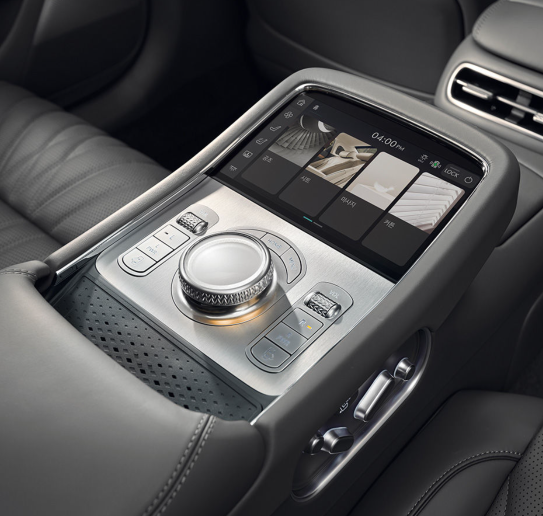 - 터치타입 공조 패널로 실내 공조 시스템을 손쉽게 조작할 수 있으며, 뒷좌석에는 자외선 살균이 되는 암레스트 수납함이 비치되어 있습니다. 레그 레스트와 풋 레스트는 연결형 구조로 되어 있는데, 마사지 기능과 열선/통풍 기능이 적용되어 사계절 내내 쾌적한 온도에서 발의 피로를 풀 수 있습니다.