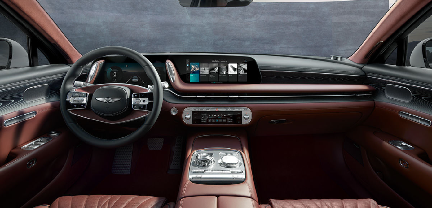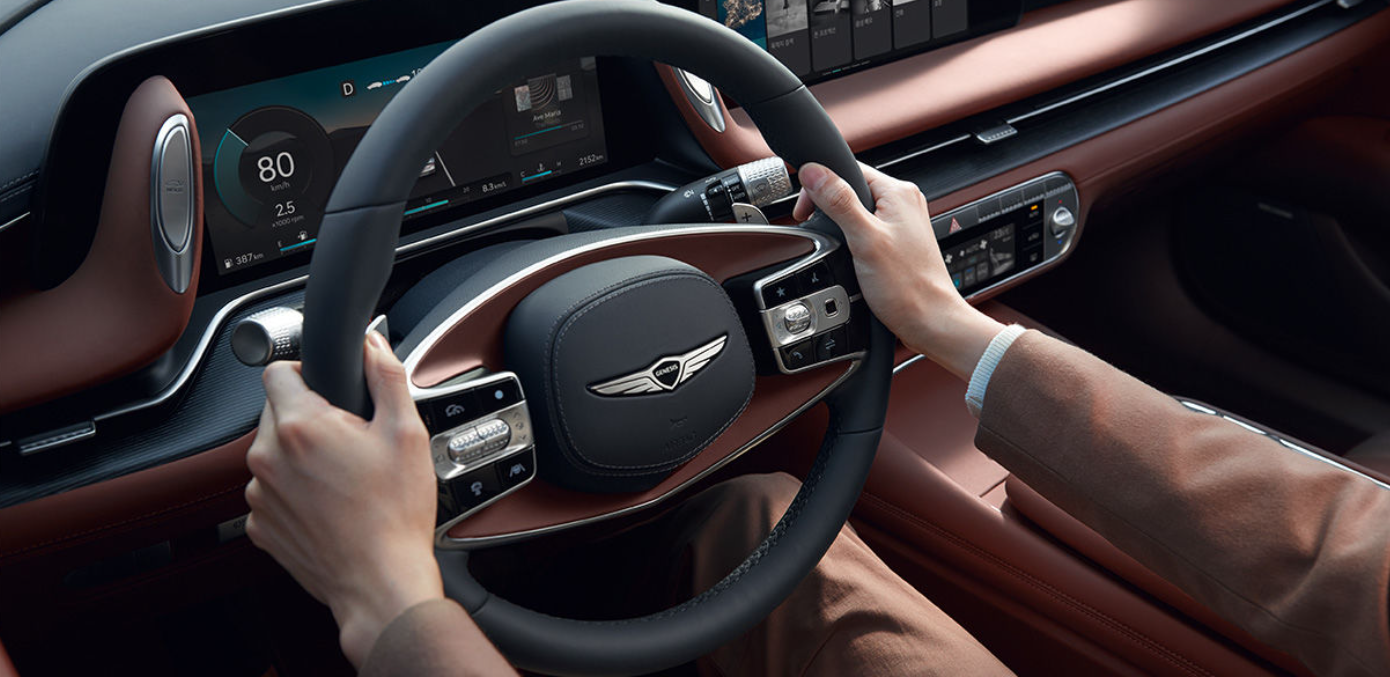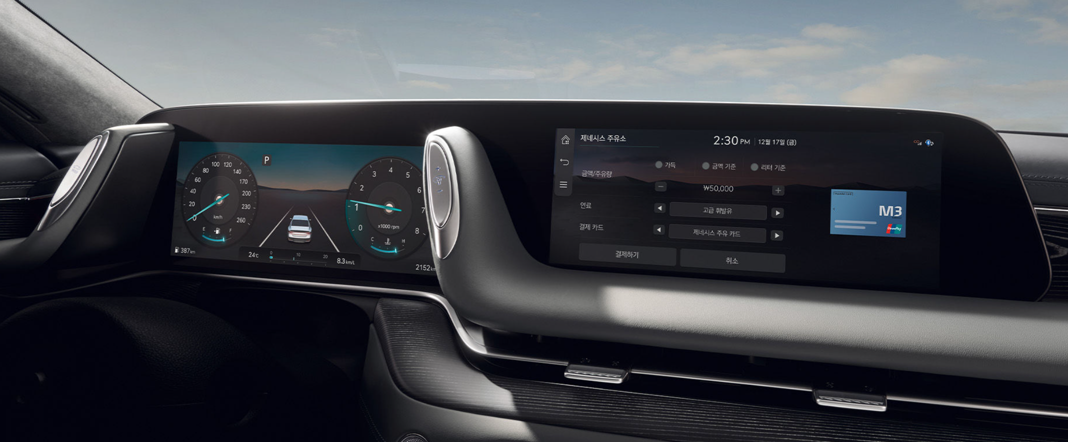 - 제네시스에 설계되어 있는 인포테인먼트 시스템은 클러스터와 내비게이션이 파노라믹 디스플레이로 연결되어 있고, 내비게이션, 헤드업 디스플레이, 클러스터 간의 콘텐츠가 자연스럽게 연동되어 있어 편리함을 제공해줍니다. 12.3인치 클러스터에는 지도, 내비게이션, 첨단 운전자 보조 시스템 등의 뷰 중 하나를 표시해 안전운전에 필요한 정보를 제공하고, 오른쪽 분할된 화면에는 전화, 미디어, 라디오, 운행정보 등의 정보를 운전자의 선택에 따라 적용할 수 있게 했습니다.