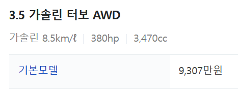 - 연비 : 복합 8.5 ~ 9.3km/l 도심 7.4 ~ 8, 고속 10.3 ~ 11.5