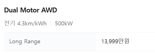 - 연비 : 복합 4.1 ~ 4.3km/kWh, 도심/고속