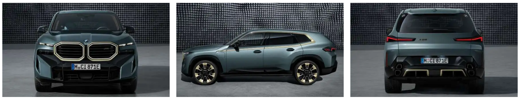 - 대형 SUV임에도 불구하고 쿠페같이 유려하고 날렵한 느낌이 나는데 그 이유는 완벽하게 균형 잡힌 비율 때문입니다. 또한 어두운 창문 색으로 BMW XM만의 강력한 캐릭터를 완성했고, 23인치 경합금 나이트 골드 휠로 더욱 독창적인 측면 디자인을 완성했습니다.