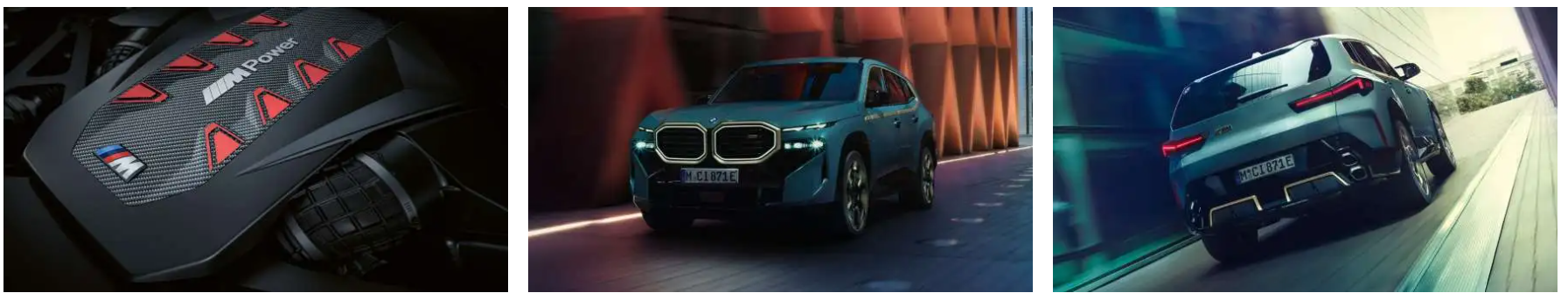 - BMW XM은 BMW의 럭셔리 SUV다운 강력한 주행 성능을 보여줍니다. 새롭게 개발된 4.4리터 M 트윈파워 터보 V8 가솔린 엔진 2개의 터보차저와 완전 가변식 밸브트로닉 밸브 컨트롤, 고정밀 분사 기능은 강력한 가속력에 도움을 줍니다. 또한 전기 모터가 결합된 M 하이브리드 드라이브 시스템은 약 62km의 순수 전기 주행을 가능하게 하며 합산 출력 최대 653마력과 81.6kg.m 토크의 강력한 퍼포먼스를 제공해줍니다.