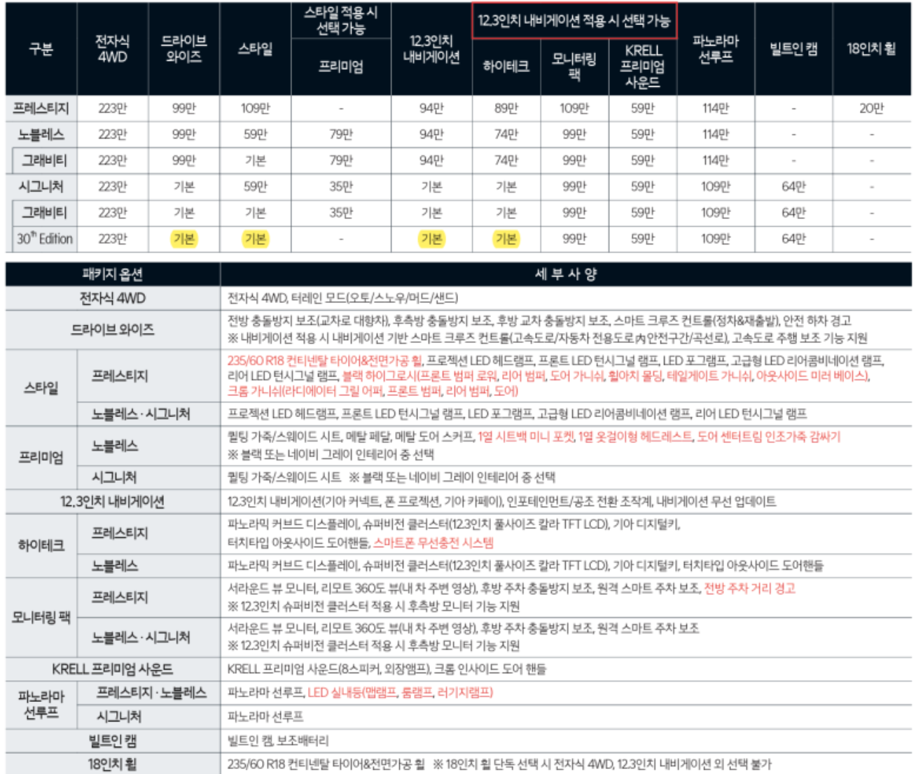 다음으로 옵션을 알아보겠습니다. 선택 품목으로는 시그니처 그래비티 트림을 선택하면 하위 트림의 기본 품목과 드라이브 와이즈, 스타일, 12.3 인치 내비게이션, 하이테크 선택 품목이 기본 적용됩니다. 추가로 비용이 발생하는 옵션은 전자식 4WD, 모니터링 팩, KRELL 프리미엄 사운드, 파노라마 선루프, 빌트인 캠 등이 있습니다.
