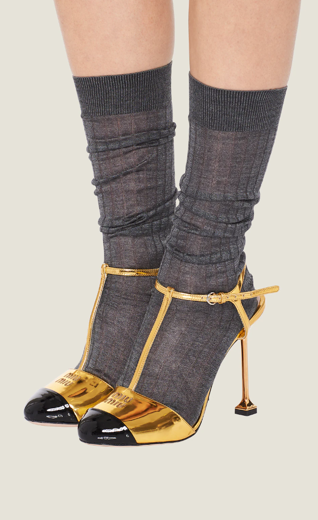 - 두 번째로는 미우미우 실크 양말입니다. 얼핏 보면 그냥 양말 같은데 재질 자체가 실크이기 때문에 완전히 기존에 신던 양말과는 다른 느낌의 양말인데요. 디자인도 세련되었지만 실제로 신으면 거의 신었는지 모를 정도로 너무 부드럽고 편안한 양말입니다. 실제로 실크 양말만 신는 분들은 다른 양말은 신기가 어렵다고 하기도 하는데요. 미우미우 실크 양말도 마찬가지로 너무나 편안한 착용감과 촉감을 가지고 있고, 특히 립 니트가 인상적인 세련된 디자인의 양말이라고 할 수 있습니다.