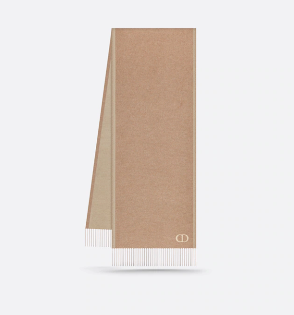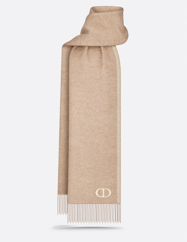 - 세 번째 제품은 디올(Dior) CD ICON 양면 스카프입니다. 명칭에서 알 수 있듯이 디올(Dior)의 상징적인 의미이자 로고인 CD 아이콘이 자수로 된 스카프이고요. 양면이 브라운과 베이지 색상으로 어떤 의상의 색에도 잘 어울리는 클래식하고 모던한 느낌의 목도리입니다.