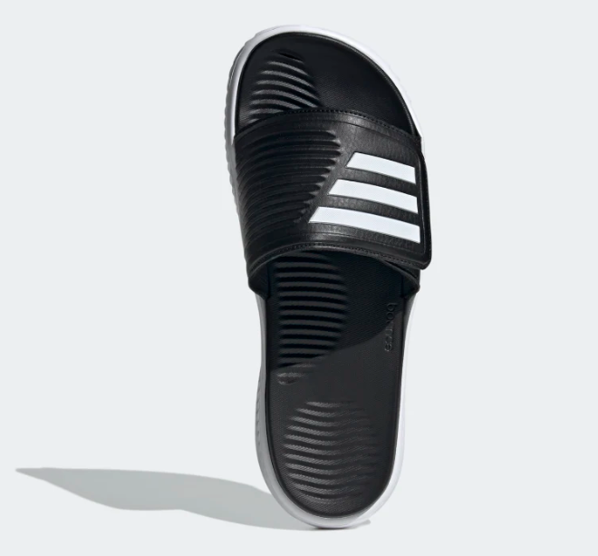 - 마지막으로 소개해 드릴 제품은 아디다스 알파 바운스 슬라이드입니다. 윗면에 아디다스의 상징인 삼선 스트라이프만 있었다면 자칫 밋밋할 수 있던 디자인에 하프만 삼선 로고를 넣음으로써 상당히 세련되고 스포티해 보이는 슬리퍼인데요. 역시나 슬립온 타입으로 사무실에서 신고 벗기가 간편하고 무엇보다 발이 정말 편안합니다. 족저근막염이 있는 지인분은 알파 바운스 슬라이드만 사무실에서 신는다고 할 정도로 좋은 쿠션감을 보여주는데요.