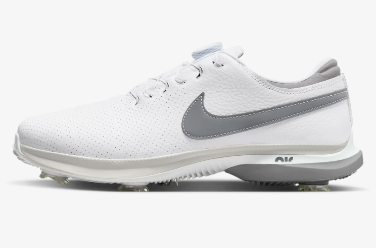 - 이러한 보아 핏 시스템 외에도 이 제품은 나이키의 여러 가지 기술들이 집약되어 있는데요. 우선 풀그레인 가죽이기 때문에 신었을 때 발에 착 감기고 편안한 느낌을 받을 수 있구요. 내부 스트랩이 발을 딱 고정해주기 때문에 스윙할 때 안정적인 자세로 제어가 가능합니다. 사진에서 보시면 바닥에 스파이크 형태로 디자인된 것이 보이실텐데 앞 부분에 챔프 스파이크라는 세 개의 스파이크와 뒷 부분에 사이클론 프로 투어 스파이크가 접지력을 향상시켜줘서 스윙 시 자세에 도움을 주고요. 에어 유닛 안에 있는 플레이트가 에너지를 반환해주고 뒤꿈치의 쿠션감이 좋아 오래 신고 다녀도 발이 전혀 불편하지 않은 골프화입니다.