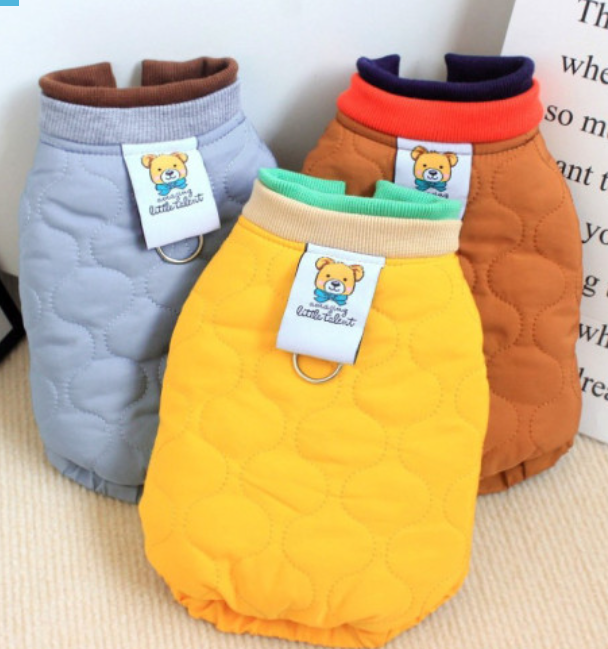 - 두 번째로는 강아지 누빔옷이 있습니다. 보통 보온성이 좋아 겨울철에 많이 입히는 옷인데요. 날이 쌀쌀하면 누빔옷만 입혀도 되지만 날이 많이 추워졌을 때는 티셔츠와 함께 레이어링 해서 입히면 더욱 따뜻하게 체온을 유지할 수 있습니다.