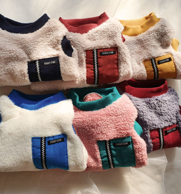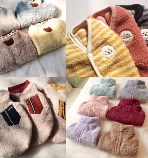 - 다음으로는 플리스가 있습니다. 겨울철에 정말 따뜻하게 입히기 좋은 옷인데요. 간혹 플리스에 지퍼가 달려 있어 강아지 털이 끼진 않을까 걱정하시는 분들도 계신데요. 요새 나오는 플리스는 대체로 강아지 털이 끼지 않도록 디자인되거나 설계되어 있기 때문에 걱정하지 않으셔도 됩니다.