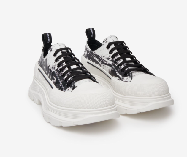 - 세번째로 소개해 드릴 제품은 트레드 슬릭 레이스업입니다. 힙한 스타일을 연출할 때 정말 감각적으로 표현할 수 있는 운동화인데요. 맥퀸 그라피티 로고가 운동화를 더욱 감각적이고 세련되게 만들어주는 제품으로 단정함과 화려함이 공존하는 스타일의 스니커즈입니다.