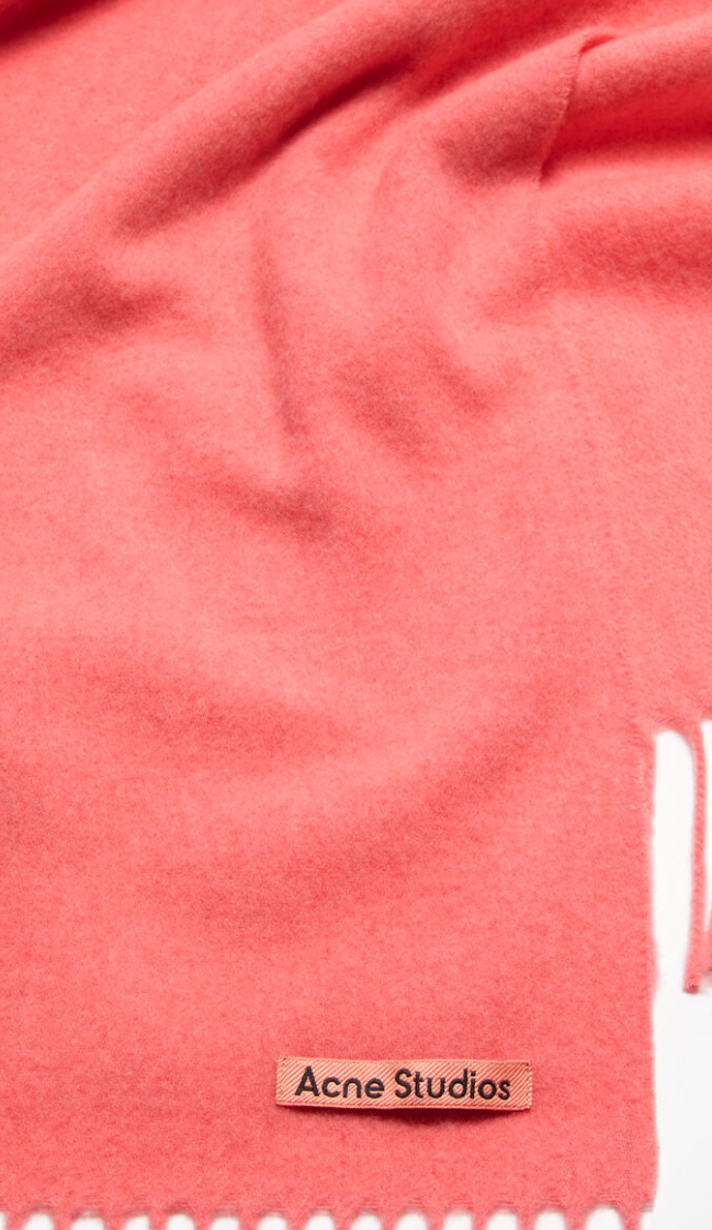 - 오늘 소개해 드릴 제품은 프린지 울 스카프 인데요. 일부러 확대 사진을 가지고 왔는데 정말 결이 곱고 아름답다는 느낌이 드는 스카프로 아크네 스튜디오 로고가 매력 포인트를 더하는 목도리입니다. 끝단이 그냥 단면으로 끝나면 조금 밋밋할 수 있는데 이 제품은 프린지 처리가 되어 있어 더 매력 있고 개성 있어 보이는 제품이고요. 역시나 울 100퍼센트 소재로 촉감이 부들부들하고 목을 부드럽게 감싸줘 겨울철 따뜻하게 착용할 수 있습니다. 목도리는 하나의 스타일링 포인트가 되기도 하는데 색상이 핑크 색상으로 여성스럽고 우아한 느낌을 연출하는데 도움이 되어 정말 많은 여성분들에게 인기 많은 제품입니다.