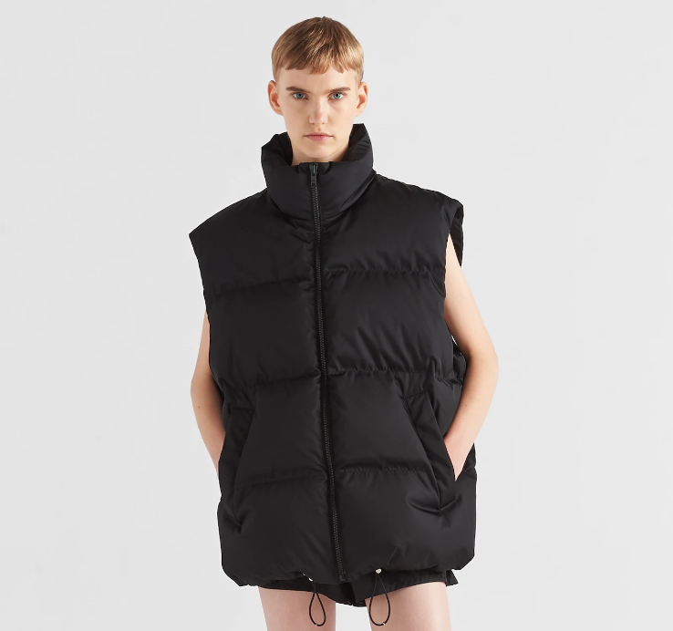 - 세 번째로 소개해 드릴 제품은 프라다의 오버사이즈 리나일론 다운 베스트입니다. 명품 브랜드 프라다에 대해 모르시는 분들은 거의 없으시겠죠? 요새 출시되는 프라다 제품들의 가장 큰 특징은 바로 원단에 있는데요. 바다에서 수거하여 재생 및 정화한 플라스틱으로 만든 제품들이 상당수를 차지하고 있어 친환경적인 측면에서 상당히 좋은 평가를 받고 있는데, 이 제품 역시 이러한 원단으로 제작된 패딩조끼입니다.