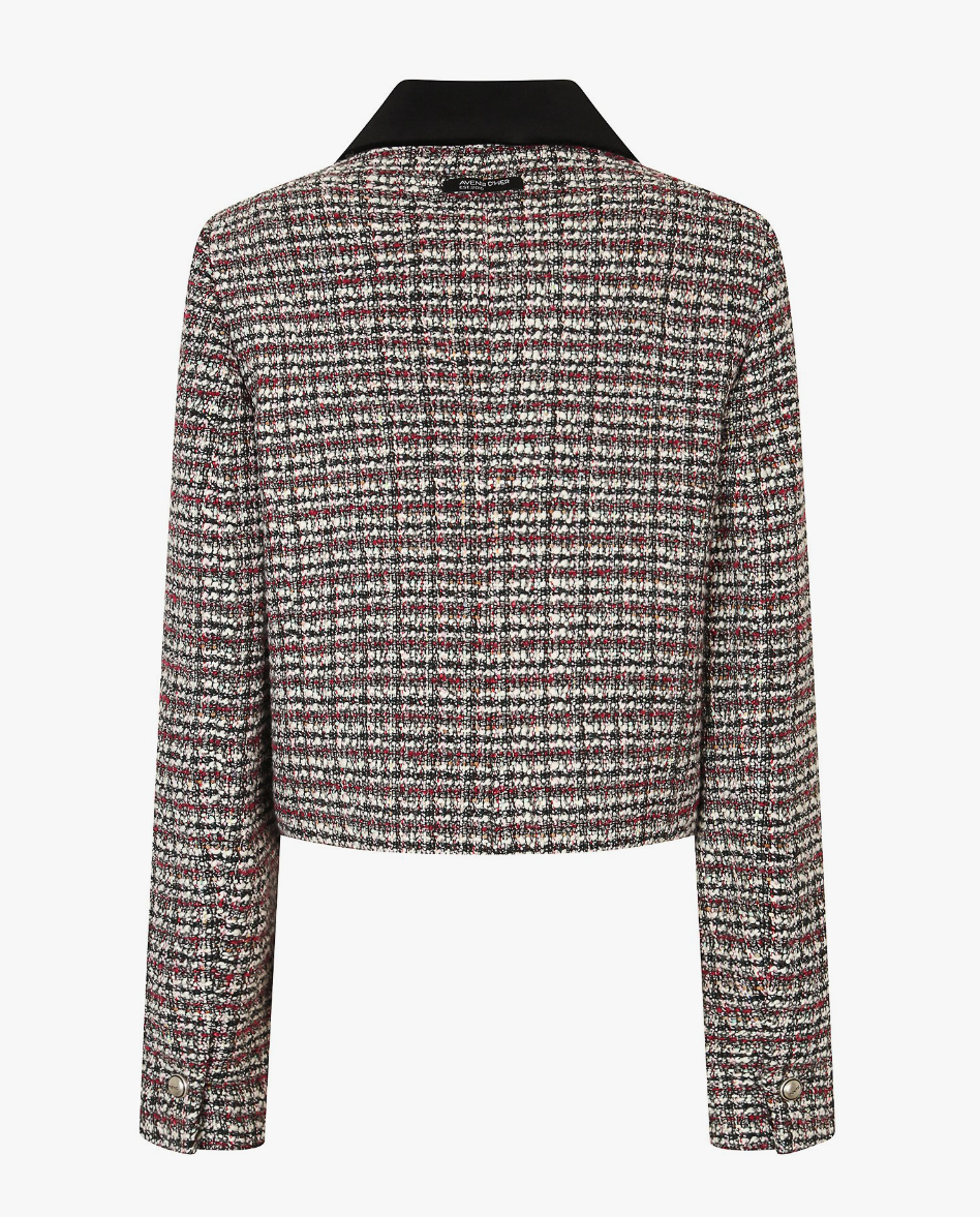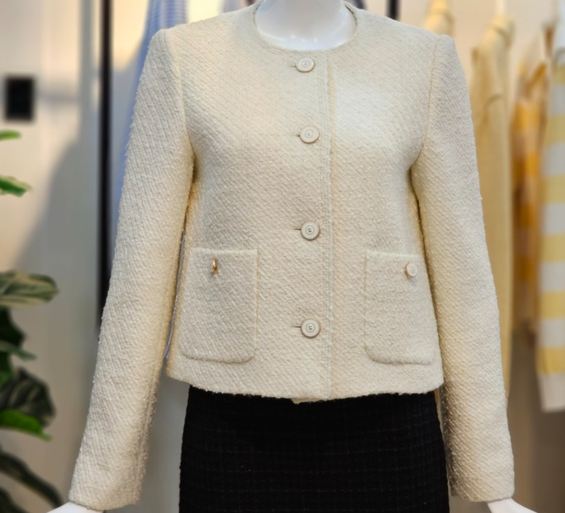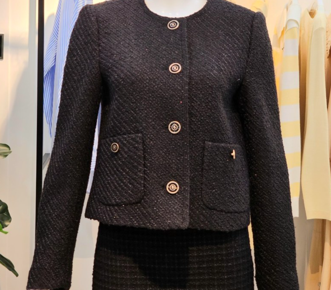 - 이 제품도 역시나 결혼식 하객룩 패션용으로 유명한 제품이구요. 트위드의 특징답게 다양한 원사가 섞인 고급 트위드 소재로 럭셔리한 느낌과 함께 세련된 느낌을 주는 자켓입니다. 특히 라운드 넥부터 내려오는 짧은 기장은 여성분들이 입었을 때 상당히 슬림하고 핏이 좋아보이는 효과도 노릴 수 있습니다. 단추는 로고가 각인되어 있는데요. 골드 단추에 로고가 각인된 형태로 세련된 포인트를 주고 있구요. 포멀룩, 캐주얼룩, 하객룩 등 다양한 스타일을 연출할 수 있는 자켓입니다.