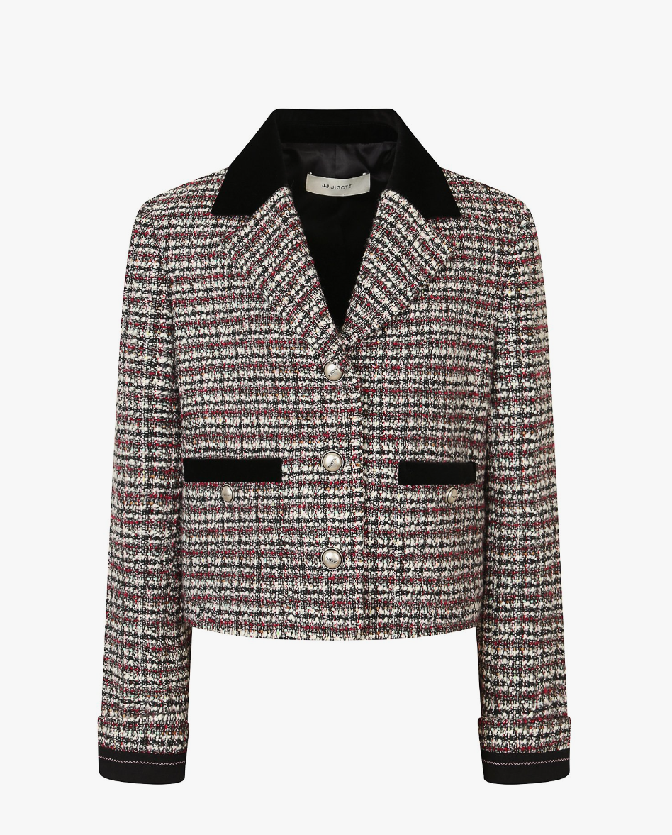 - 마지막으로 소개해 드릴 제품은 JJ지고트의 트위드 자켓입니다. 정확한 명칭은 벨벳 배색 크롭 트위드 자켓이구요. 가격은 약 34만원 정도입니다. 트위드 텍스처 자체가 가을, 겨울에 어울리는 배색으로 나와서 시즌으로 입기 정말 좋은 자켓입니다. 컬러와 포켓라인의 벨벳 배색이 상당히 고급스러운 느낌이 나는 자켓이구요. 크롭 기장으로 허리라인에 슬림하게 떨어져 여성스러운 핏이 가능한 재킷입니다.