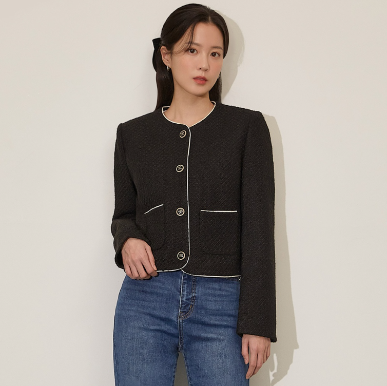 - 자세한 특징을 하나씩 살펴보면 우선 카라 없는 둥근 넥으로 인해 목선이 길어보이는 효과가 있구요. 카라 깃부터 내려오는 아웃라인과 배색 라인의 디테일이 돋보이는 디자인입니다. 어깨선쪽에는 4mm의 어깨 패드가 들어가 탄탄한 느낌을 주고요. 포켓은 깊이감이 있어 편리합니다. 특히 블랙의 에폭 단추가 정말 포인트인데, 실제로 고급스럽고 우아한 느낌을 주는 디자인으로 부착되었습니다. 가을, 겨울철 아우터 속에 받쳐 입기 정말 좋은 트위드 자켓이고 가성비 좋은 제품을 찾으시는 분들께 추천해 드리고 싶은 제품입니다.
