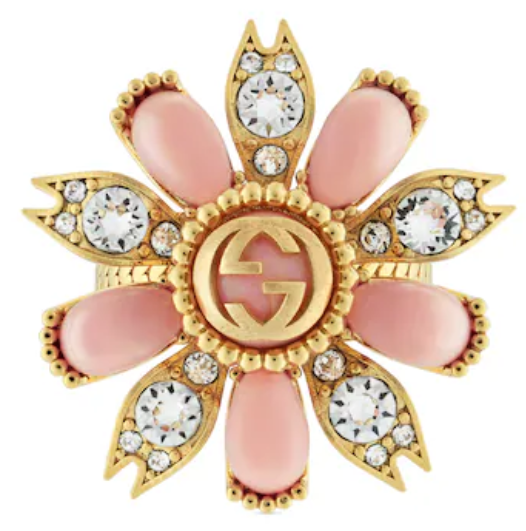 - 두 번째의 인터로킹 G 플라워 반지는 구찌의 심벌 스타일인 인터로킹 G와 플라워 형상을 결합하여 특유의 분위기를 만들어 내는 반지입니다. 옐로우 골드 톤 메탈 소재에 스테이트먼트 솔리테어를 장식한 반지인데요. 솔리테어는 프랑스어로 '유일한' ,'독신한'과 같은 뜻을 가지고 있어 원석의 아름다움을 표현할 때 사용합니다. 이렇게 솔리테어의 디자인을 함으로써 다이아몬드 그 자체의 아름다움을 나타내며 플라워 형상과 결합하면서 화려하고 세련된 느낌을 주는 반지입니다. 가격은 84 만원입니다.