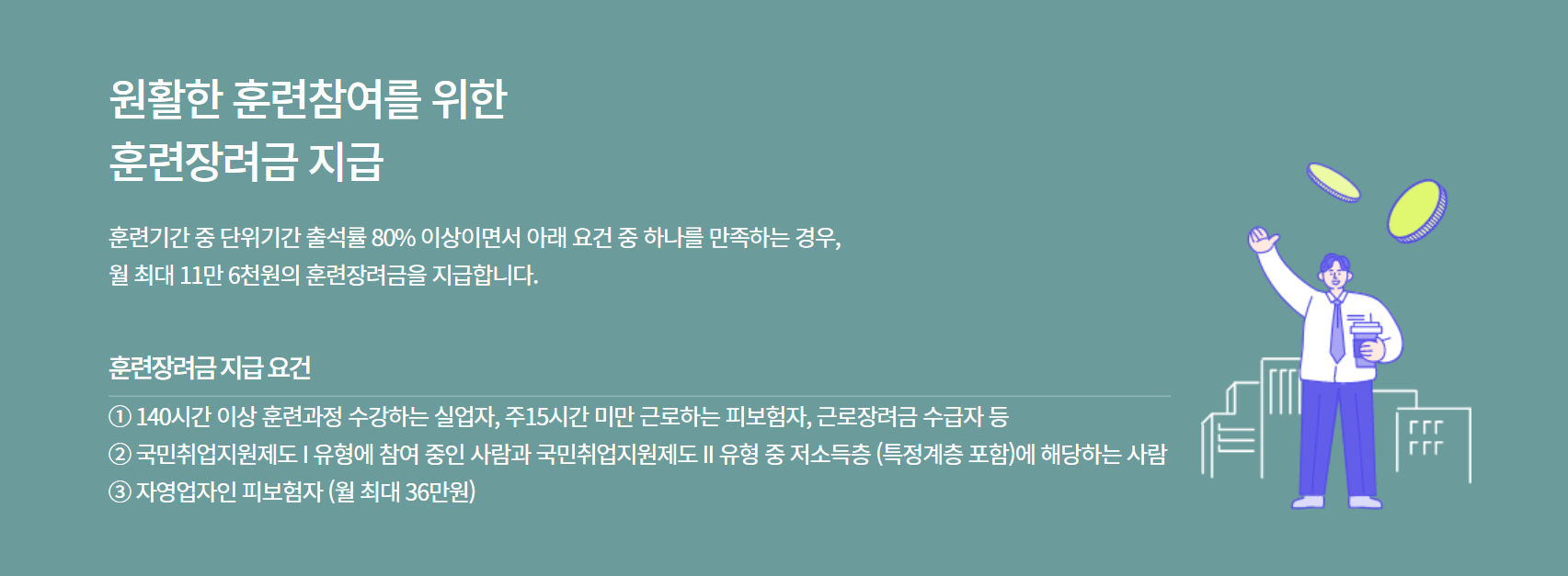 - 국민 내일 배움 카드는 열심히 수강한 사람에게 추가로 훈련 장려금을 지급합니다. 단위기간 출석률이 80% 이상이고 아래의 지급요건을 충족하는 경우 월 최대 11만 6천원의 훈련장려금을 지급받을 수 있습니다.