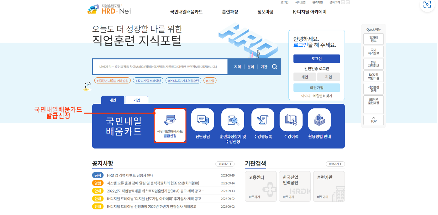 - 국민 내일 배움 카드는 직업훈련 포탈인 HRD-Net에서 신청할 수 있습니다. 일반 포털에서 검색하면 쉽게 찾을 수 있습니다. 사이트에 들어가면 각 탭마다 내용이 자세히 나와있는데 회원가입부터 하셔야 합니다.