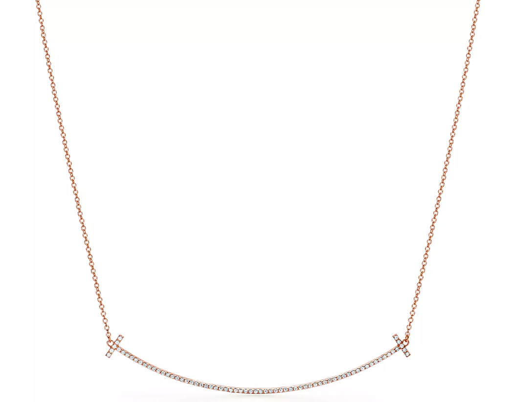 - 티파니 T는 일명 스마일 펜던트라고 불리기도 하는데요. 그 이유는 사진에서 보시는 것처럼 웃는 모양의 '스마일' 디자인으로 되어 있기 때문입니다. 미소가 선사하는 행복감과 유대감을 상징한다는 티파니 T는 얼핏 보면 단순해 보이지만 실제로 굉장히 유려하면서 우아한 곡선으로 럭셔리한 느낌을 전해줘 많은 분들에게 인기 있는 제품이고요. 가격대도 기본 200만 원대부터 보석이 얼마나 들어가는지에 따라 400만 원대, 800만 원대 등 가격 분포도가 나누어지기 때문에 상황에 맞게 고르기도 좋습니다.