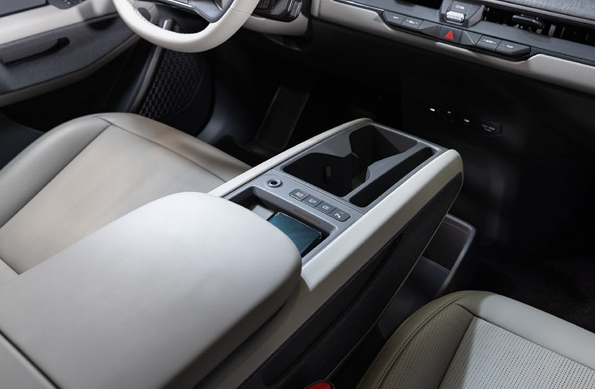 - 기아 EV9의 실내는 시트와 센터 콘솔 등 실내 구성요소를 정제된 느낌이 들도록 디자인하여 탑승자는 뛰어난 공간감을 느낄 수 있습니다. 실내는 최근 현대 자동차 차량처럼 변속 조정기를 컬럼 타입으로 운전대 뒤에 부착하여 더 직관적인 조작이 가능하게 했을 뿐만 아니라 센터 콘솔의 공간감도 확대 되었습니다.
