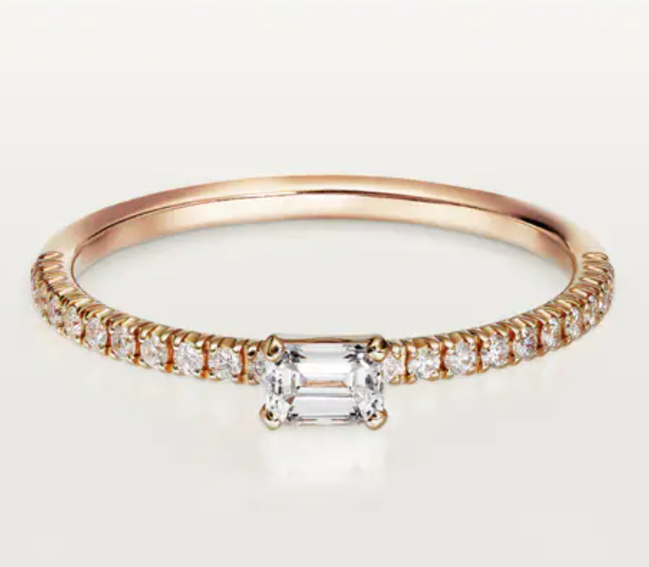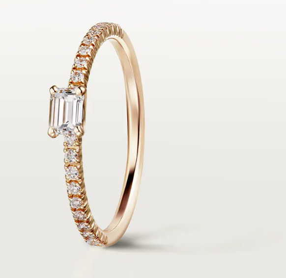 - 까르띠에 에땅셀 드 까르띠에 반지의 또 다른 특징 중 하나는 파베 다이아몬드 형태로 만든다는 점입니다. 파베 다이아몬드는 다이아몬드를 세팅할 때 오밀조밀하게 정확한 간격으로 세팅하여 극적인 반짝임을 연출하는 효과가 있는데요. 따라서 까르띠에 에땅셀 드 까르띠에는 디자인은 단순해 보이지만 반짝거리는 다이아몬드들이 모이면서 극적인 화려함과 우아함을 연출합니다. 가격은 400 만원대로 기타 반지 라인업에 비해 다소 저렴한 편이라고 할 수 있습니다.