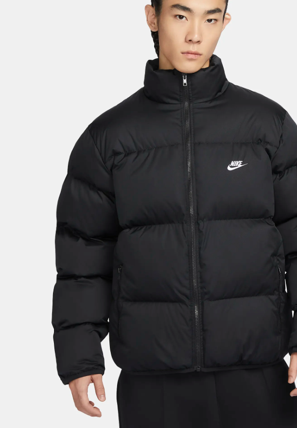 - 세 번째로 소개해 드릴 제품은 나이키 스포츠웨어 클럽입니다. 나이키의 대표적인 남성 패딩 라인 중 하나라고 할 수 있는데요. 이 제품 역시 75% 이상 재생 폴리에스터 섬유로 제작되어 친환경 제품입니다. 깔끔하고 단정한 패딩 라인에 나이키 스우시가 들어가면서 스포티하고 개성 있는 패딩으로 많은 남성분들에게 인기 있는 제품이고요. 미드로프트 디자인의 패딩입니다.