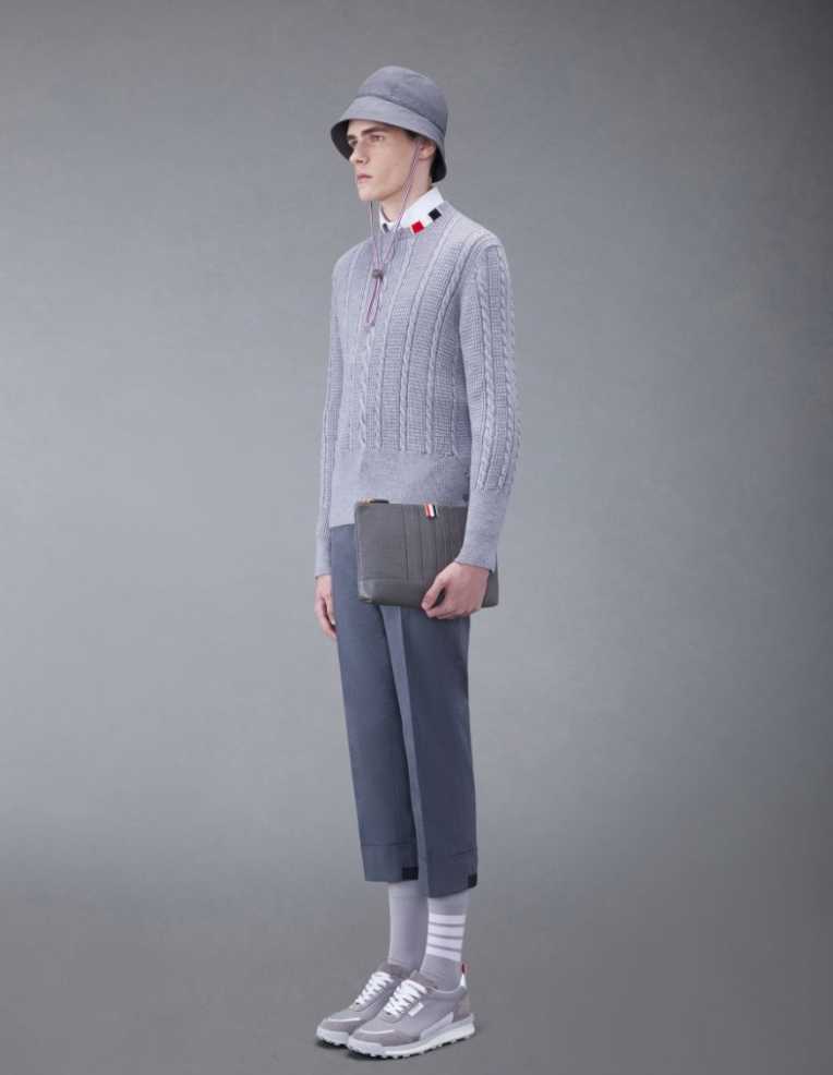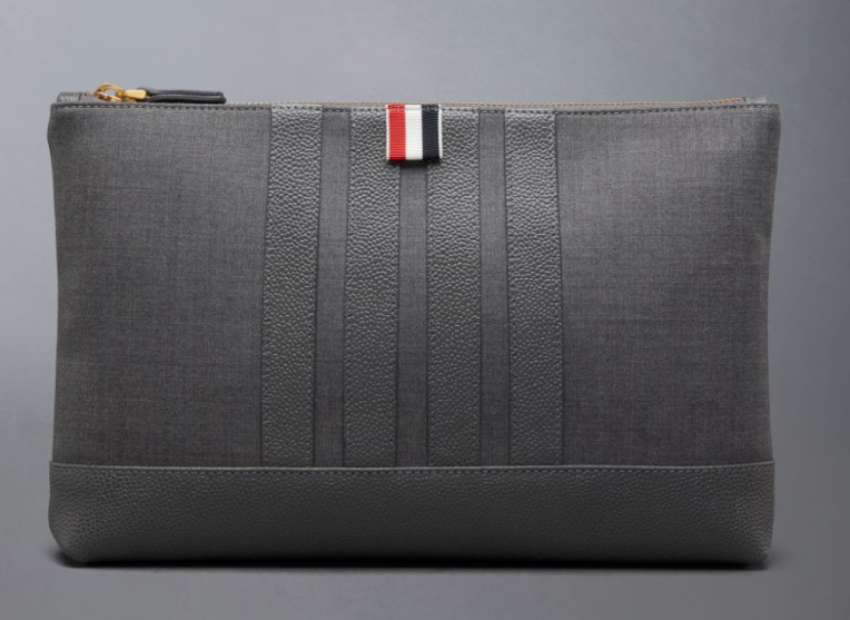 - 마지막으로 소개해 드릴 제품은 톰 브라운의 울 4 바 라지 파우치입니다. 톰 브라운은 미국의 패션 디자이너인 톰 브라운에 의해 탄생한 미국 패션 명품 하우스로 국내에서도 굉장히 인기가 많죠? 가끔씩 좀 노는 애들이 입고 다닌다는 편견이 있지만 실제로는 이와 달리 세계적으로 굉장히 유명하고 고급스러운 명품 브랜드로 유명합니다.