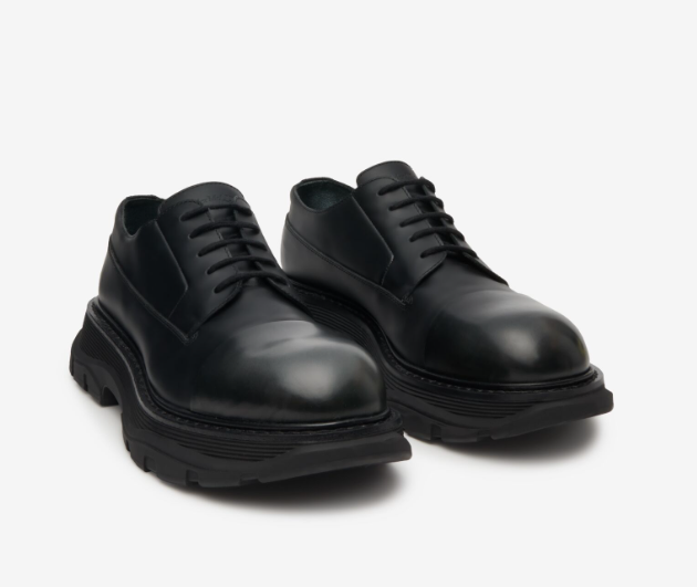- 이 제품은 밑창이 고무로 되어 있는데 어느 정도 굽이 있기 때문에 키높이 효과도 볼 수 있고요. 밑창이 둥그스름한 라운드 토우이기 때문에 상단은 날렵하고 하단은 둥근 쉐입으로 조화롭게 디자인되었습니다. 레이스업 잠금장치로 텅에 음각으로 새겨진 알렉산더 맥퀸이 포인트가 되며 브러시 처리된 가죽 토 캡으로 럭셔리한 스타일을 연출할 수 있습니다. 정장뿐만 아니라 일상복에도 상당히 잘 어울리는 제품입니다.