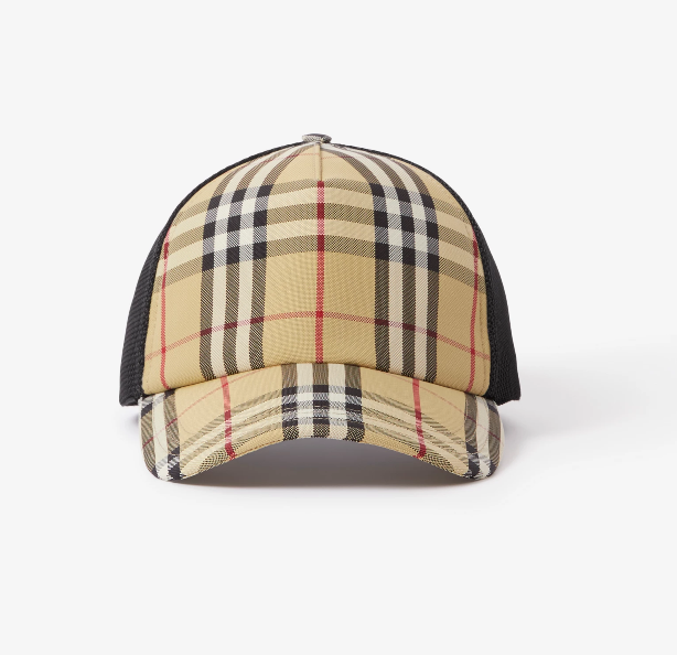 - 오늘 소개해 드릴 체크 메쉬 야구 모자 같은 경우 버버리의 가장 상징적인 색상과 패턴을 사용해 만들어진 제품이고요. 메쉬 소재의 패널로 머리에 통풍도 잘 되기 때문에 계절에 상관없이 사용할 수 있는 것이 장점입니다.