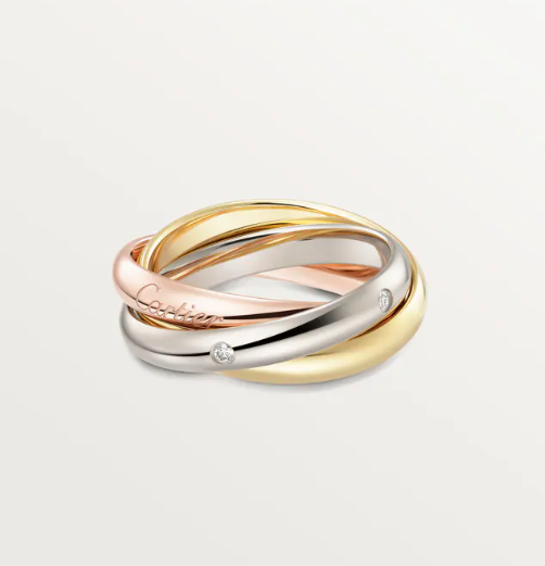 - 세번째로 살펴볼 제품은 까르띠에의 트리니티 링입니다. 세 가지의 서로 다른 색상의 반지가 절묘하게 조화를 이루면서 하나의 반지를 이루는 것이 특징인 제품입니다. 까르띠에의 창립자인 루이 까르띠에가 처음 트리니티 링을 만들 때 인생에서 가장 중요한 가치 세 가지를 각각의 링에 담았다고 하는데요. 각 링이 의미하는 바는 사랑, 믿음, 우정입니다.