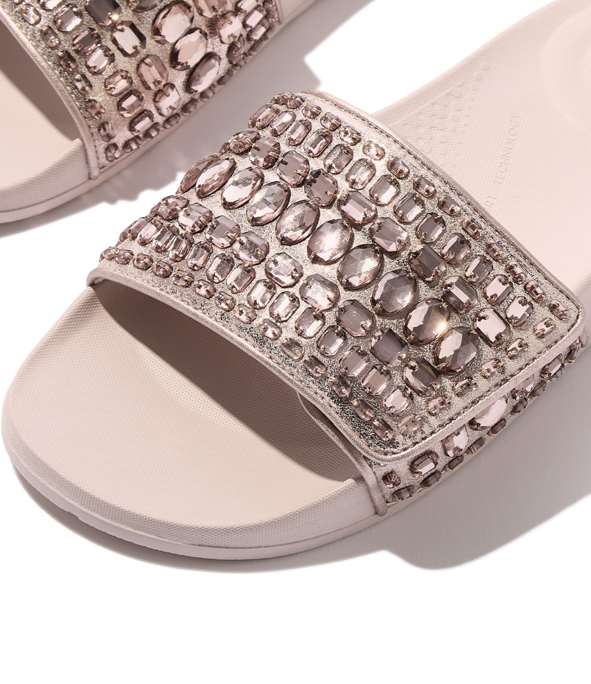 세 번째 추천해 드리는 제품은 이번에 나온 신상품인데요. 크리스털 연핑크 여성 슬라이드 입니다. 슬라이드 형식의 아이쿠션으로 이번에 주얼리 장식이 더해져서 출시되었고요. 간편한 스트랩으로 핏을 자유롭게 조절할 수 있는 제품입니다.