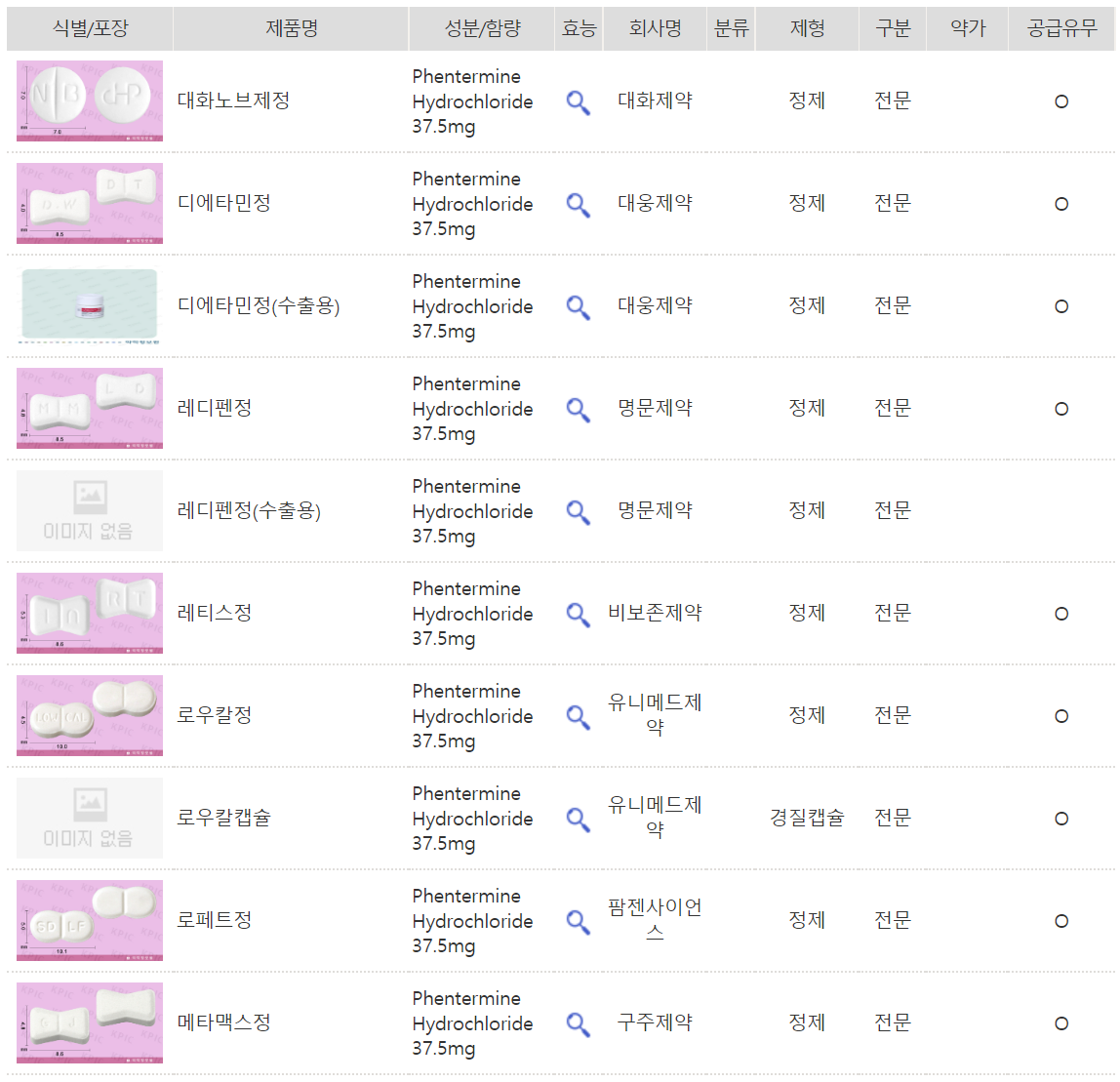 펜터민 제재의 약 종류들은 디에타민정, 대화노브제정, 레디펜정, 아디펙스캡슐, 레티스정, 로우칼정, 로페트정, 메타맥스정, 슬레민정, 틴틴정, 비엠진정 등 다양한 종류가 있습니다.