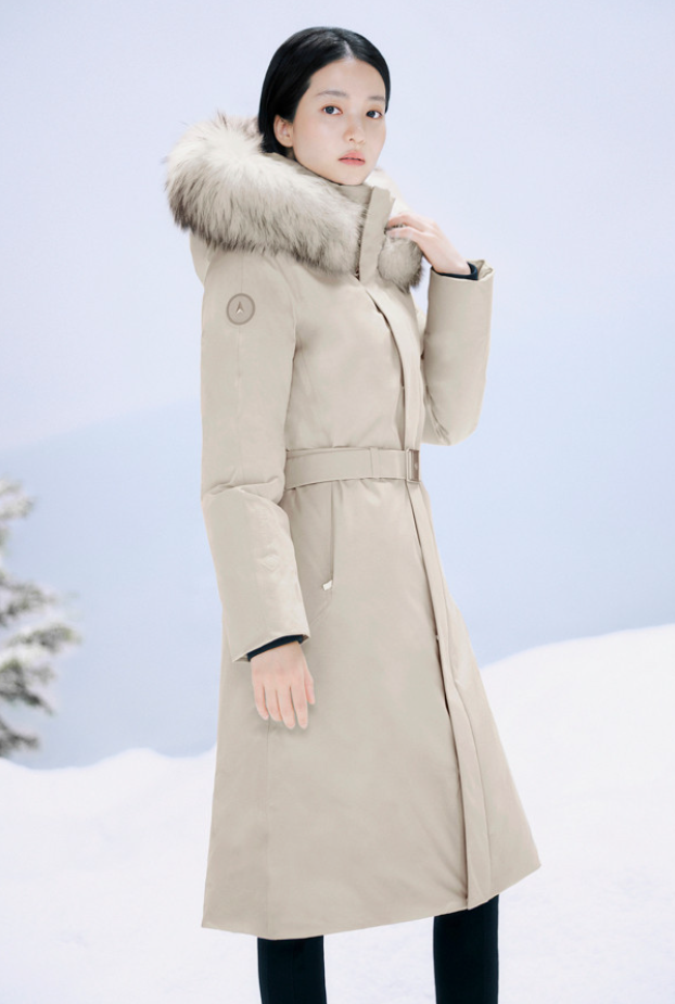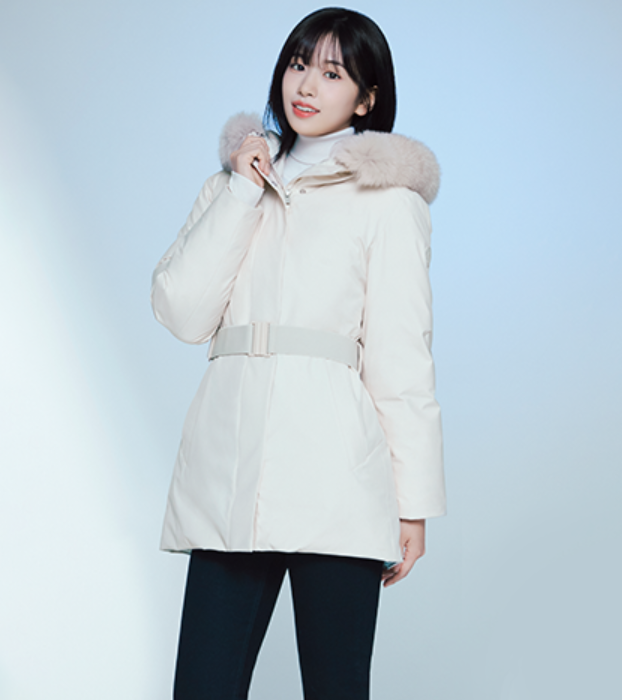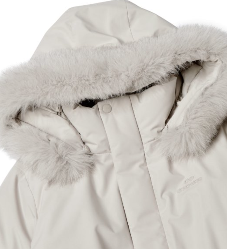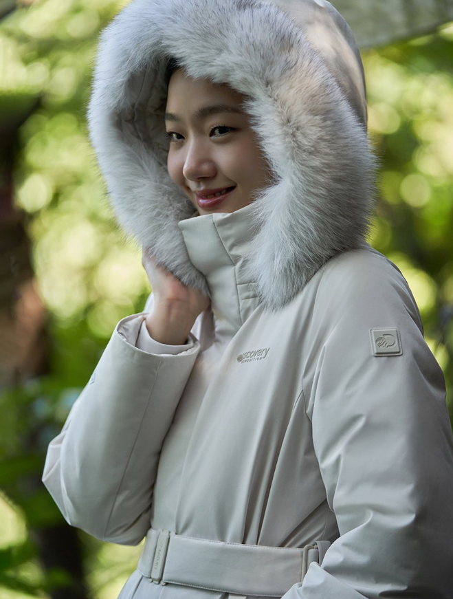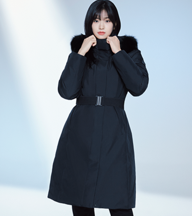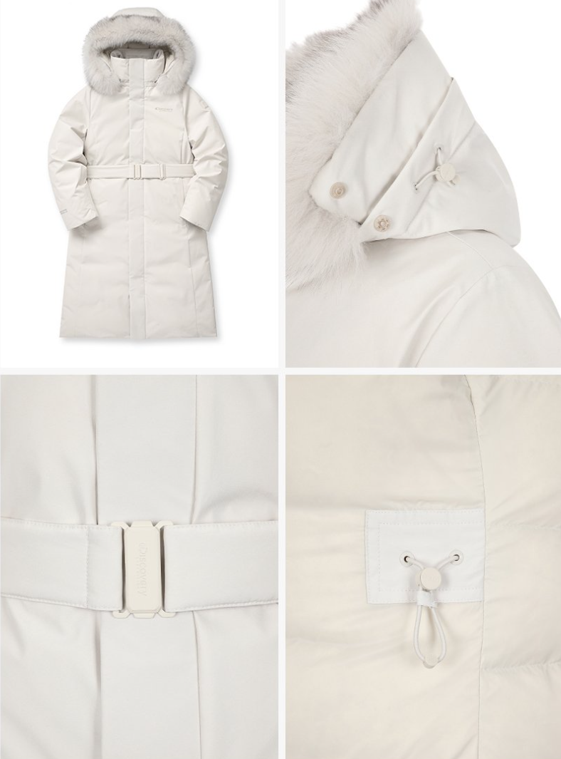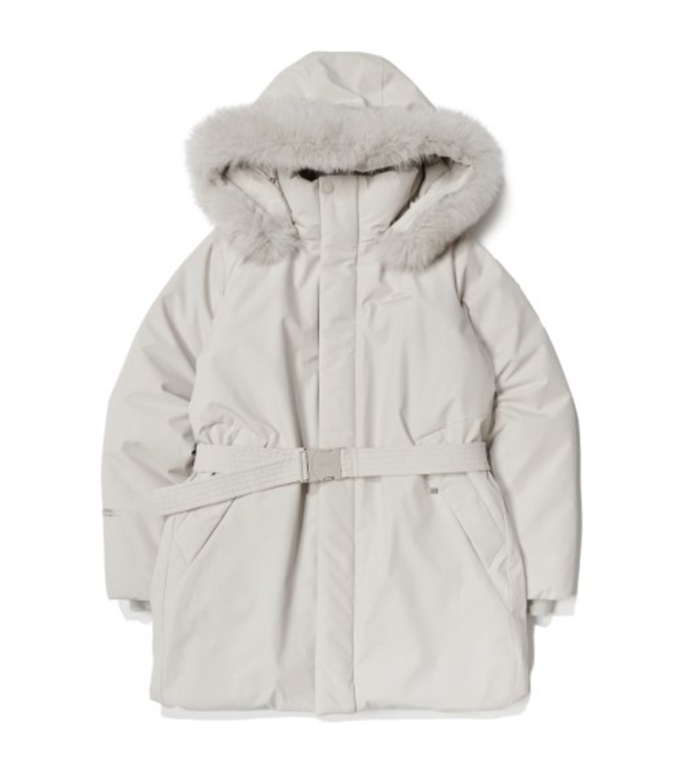 - 충전재에는 유러피안 구스다운 충전재가 사용되었는데요. 보온성이 좋기로 소문난 구스다운 충전재가 필파워로 풍성하게 들어가 있기 때문에 상당히 따뜻하게 입을 수 있고요. 특히 모자 부분에 유럽산 블루 폭스퍼가 후드에 적용되어 있어서 더 따뜻하게 보온성을 올려줄 뿐만 아니라 고급스러운 느낌도 함께 연출이 가능합니다.
