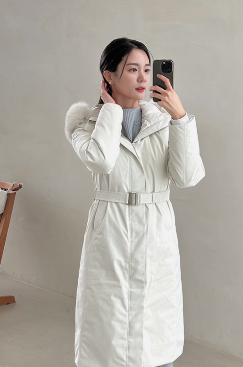- 충전재는 다른 패딩과 마찬가지로 구스다운을 사용했지만 타 브랜드의 상품들은 8:2의 비율이지만 씬에어는 9:1의 비율이고요. (거위 깃털과 솜털의 비율) 봉제선 심실링이라고 해서 완벽한 실루엣을 완성시켜 주면서 방수 기능도 뛰어납니다. 기타 제품과 마찬가지로 머리 부분에는 블루폭스 퍼가 장착되어 있고요. 퍼는 프리미엄 SAGA 유럽 인증을 받은 소재입니다. 오늘은 롱패딩을 설명드리기 위해 앱솔루트 롱W 제품을 가지고 왔지만 기장도 하프/미들/롱으로 다양하게 선택하실 수 있습니다. 허리 벨트도 상당히 고급스러운 느낌으로 되어 있어서 우아하고 세련된 스타일링을 연출하실 수 있구요. 가격이 기타 브랜드 롱패딩보다 살짝 더 비싼 편이지만 그만큼 최상위급 소재로 디자인되었다고 보시면 좋을 것 같습니다.