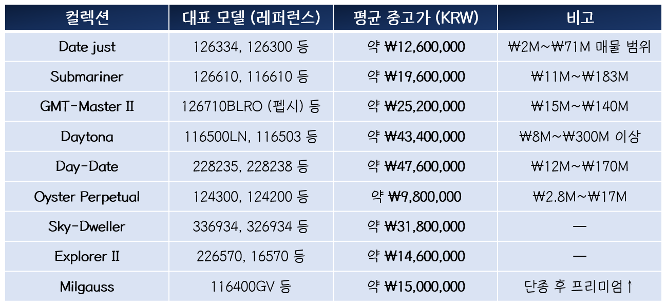먼저 현재 2025년 7월 28일을 기준으로 롤렉스 대표적인 모델의 중고 가격은 어떻게 되는지 살펴볼게요.