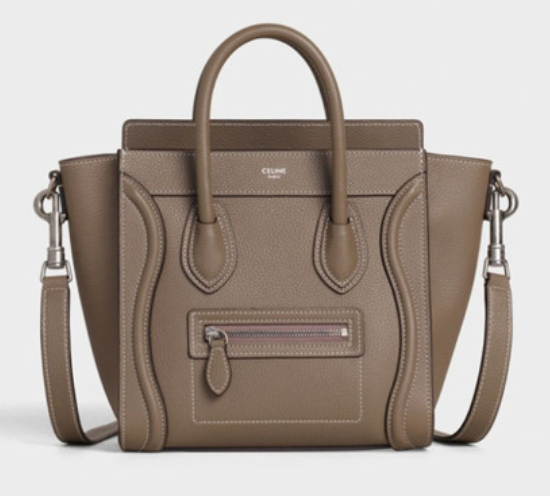 - 첫번째로 소개해 드릴 제품은 바로 셀린느 러기지백입니다. 안감이 카프스킨으로 되어 있으며 실버로 피니쉬 했고, 핸드백이나 숄더백, 크로스바디백으로 모두 활용할 수 있는 제품입니다. 사이즈는 세 가지 사이즈로 나노, 마이크로, 미니로 나누어지는데 요새는 사이즈가 큰 백보다 작은 사이즈가 인기가 많다보니, 나노가 가장 인기 있는 편입니다.