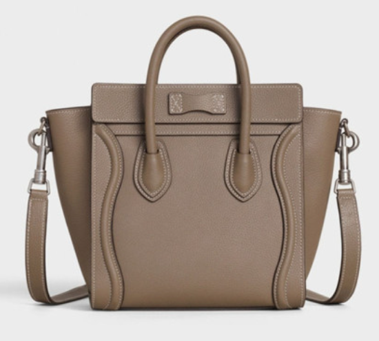 - 첫번째로 소개해 드릴 제품은 바로 셀린느 러기지백입니다. 안감이 카프스킨으로 되어 있으며 실버로 피니쉬 했고, 핸드백이나 숄더백, 크로스바디백으로 모두 활용할 수 있는 제품입니다. 사이즈는 세 가지 사이즈로 나노, 마이크로, 미니로 나누어지는데 요새는 사이즈가 큰 백보다 작은 사이즈가 인기가 많다보니, 나노가 가장 인기 있는 편입니다.