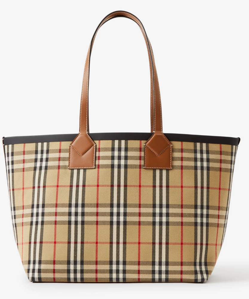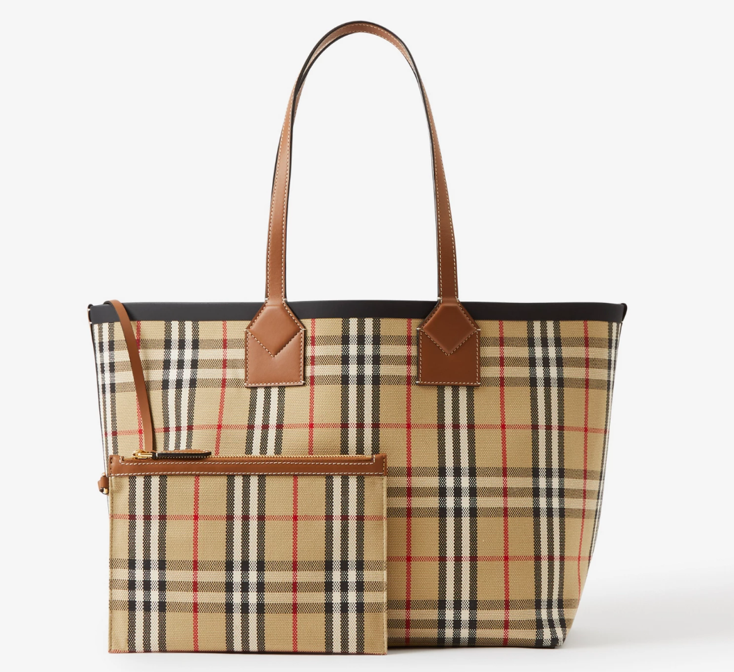 - 마지막 제품은 체크 코튼 미디엄 런던 토트백입니다. 가격은 2,550,000 원입니다. 면 캔버스로 제작된 여유로운 사이즈의 토트백으로 자카드직으로 연출된 버버리 체크가 돋보이며 스티치 디테일의 가죽 손잡이와 탈착식 지퍼 파우치가 특징인 백입니다.