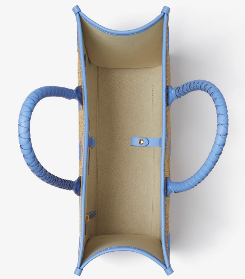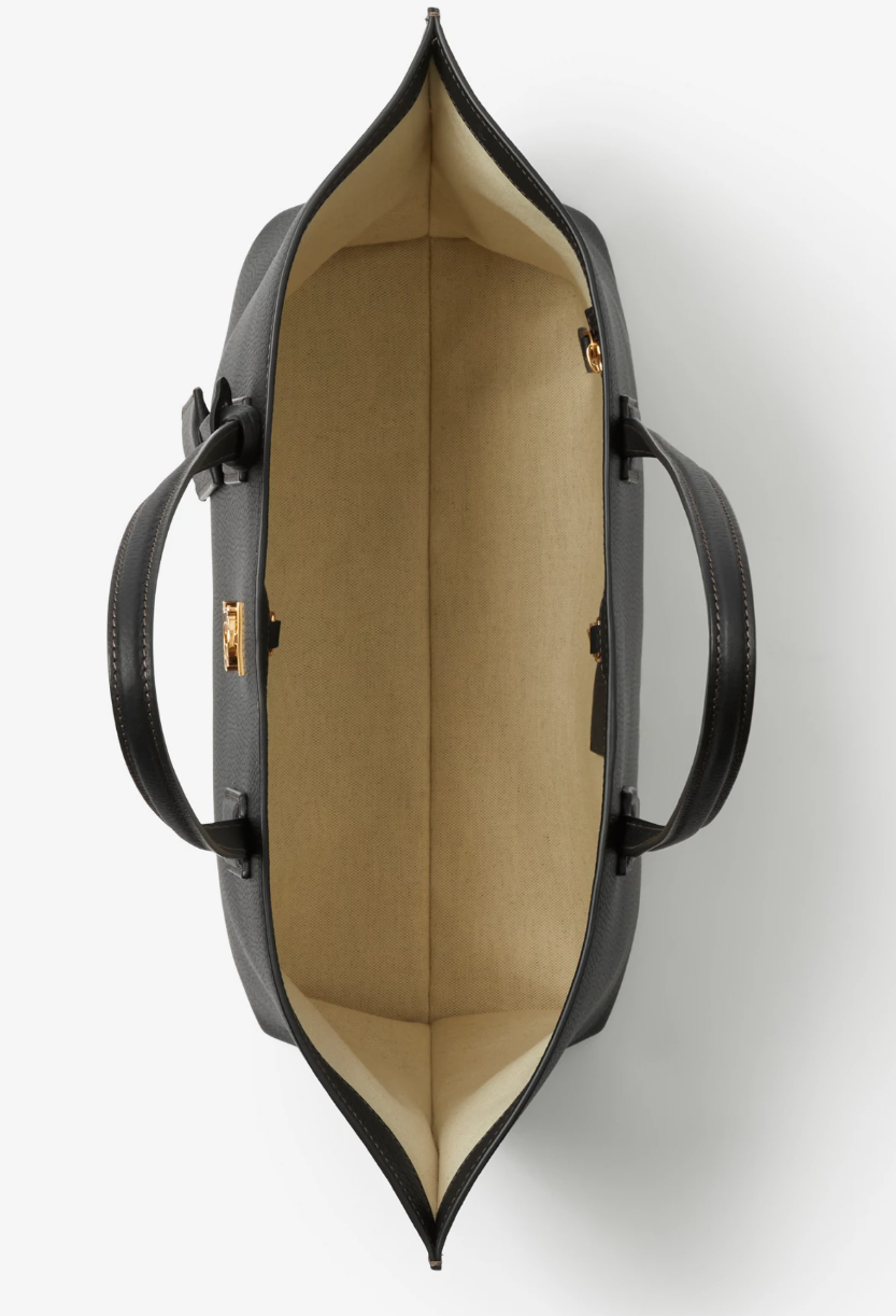- 사이즈는 51.3 x 18.5 x 29cm이며 숄더 스트랩 길이는 26cm입니다. 겉감은 면 100%로 되어 있고 트리밍은 100% 송아지 가죽입니다. 안감은 면 100%로 되어 있습니다. 상단에 가죽 손잡이가 있으며 오픈 톱, 수작업으로 마감 칠 된 테두리, 광택 있는 금속 하드웨어로 구성되어 있습니다.