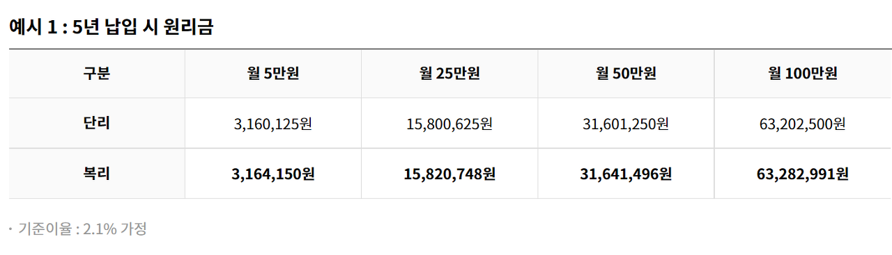 단순히 저축의 개념을 넘어서 복리 이자를 받을 수 있다는 장점이 있습니다. 월 5만원씩 5년 이상 납입을 하시면 복리가 적용이 되는데, 적금과 비교해서도 나쁘지 않은 이율입니다. 현재 2022년 4분기를 기준으로 연 3.2%의 이율이 적용되고 있는데, 금리가 올라가면 이율도 올라가는 장점이 있습니다.