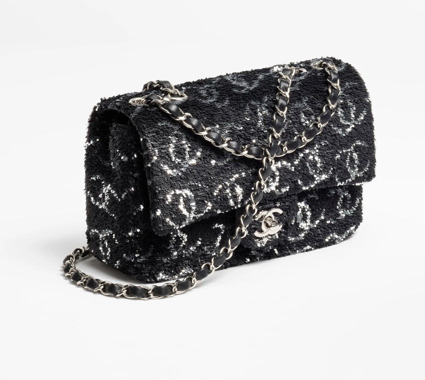 - 이번에 새로 나온 샤넬 이브닝 백 같은 경우에는 시퀸으로 제작되어 화려하면서도 고급스러움을 나타내주고 실버 메탈이 이를 완성시켜줍니다. 시퀸(Sequin)이라는 것은 장식용으로 옷감이나 가방 등에 반짝이는 금속조각이나 스팽글 같은 것을 자수하거나 붙여서 아름답게 만들어주는 용도인데요. 이브닝 백의 상기 사진에서 보시는 것처럼 반짝반짝 거리는 시퀸으로 럭셔리하면서도 아름다움을 자아내는 것이 이번 샤넬 이브닝 백의 특징이라고 할 수 있습니다.
