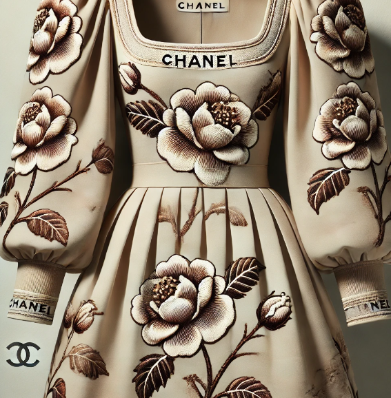 다음으로 카멜리아가 들어간 패션입니다. 상기 제품은 고품질의 원단으로 제작된 샤넬의 고급 드레스인데요. 여기에도 역시 카멜리아가 들어가서 더욱 고급스러운 느낌을 잘 살려줍니다. 카멜리아 꽃이 자수 또는 프린트로 들어가 더욱 돋보이는 드레스입니다.