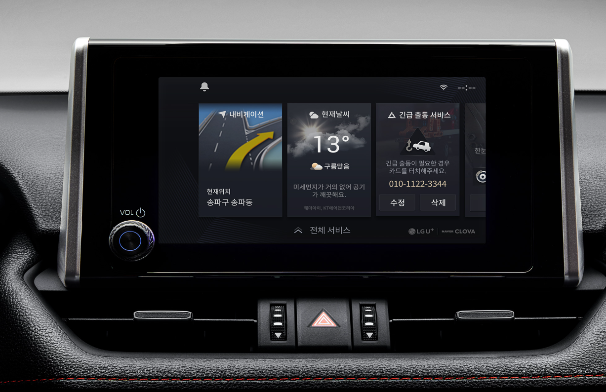 - 통신형 내비게이션은 실시간 교통 정보는 물론이고 주유소, 주차장, 과속 카메라 정보 등을 제공하며 OTA를 통해 자동으로 업데이트 됩니다. 네이버 클로바 AI 음성인식 기능은 온도 조절, 내비게이션, 라디오 등의 차량 기능을 음성 명령으로 제어할 수 있고, 스트리밍으로 제공되는 음악, 날씨, 뉴스, 팟캐스트 앱 서비스 등의 실행이 가능합니다.