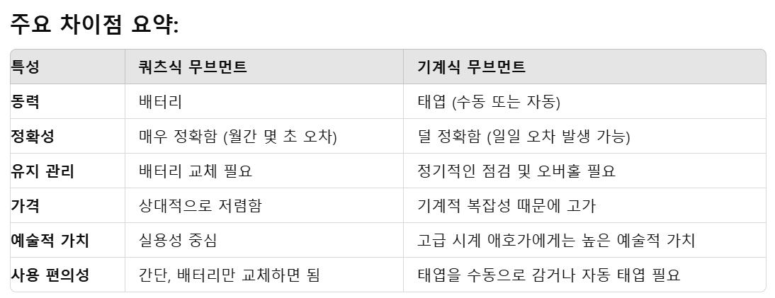 쿼츠식 무브먼트(Quartz Movement)와 기계식 무브먼트(Mechanical Movement)는 시계의 작동 방식에 있어 중요한 차이점을 보입니다. 각각의 무브먼트는 시계의 동력, 정확성, 유지 관리 측면에서 서로 다른 특징을 가지고 있습니다.