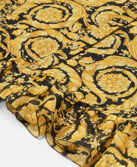 - 이 제품 역시도 키즈용이지만 여느 베르사체 성인 옷과 같은 화려한 무늬와 문양, 색감이 특징인 제품입니다. 메두사 프린팅에 러플드 밑단, 포인티드 칼라, 반소매 등이 특징이고요. 안감은 아세테이트와 실크, 겉감은 실크로 이루어졌기 때문에 촉감이 굉장히 보드랍고 감촉이 좋은 제품이라 아이들이 입는데 전혀 불편함이 없다는 것도 좋습니다. 만약 아이에게 명품 잠옷을 입히고 싶고 (평생 한 번뿐인), 베르사체 특유의 분위기를 좋아하시는 분들이라면 이 제품을 적극 추천해 드립니다.