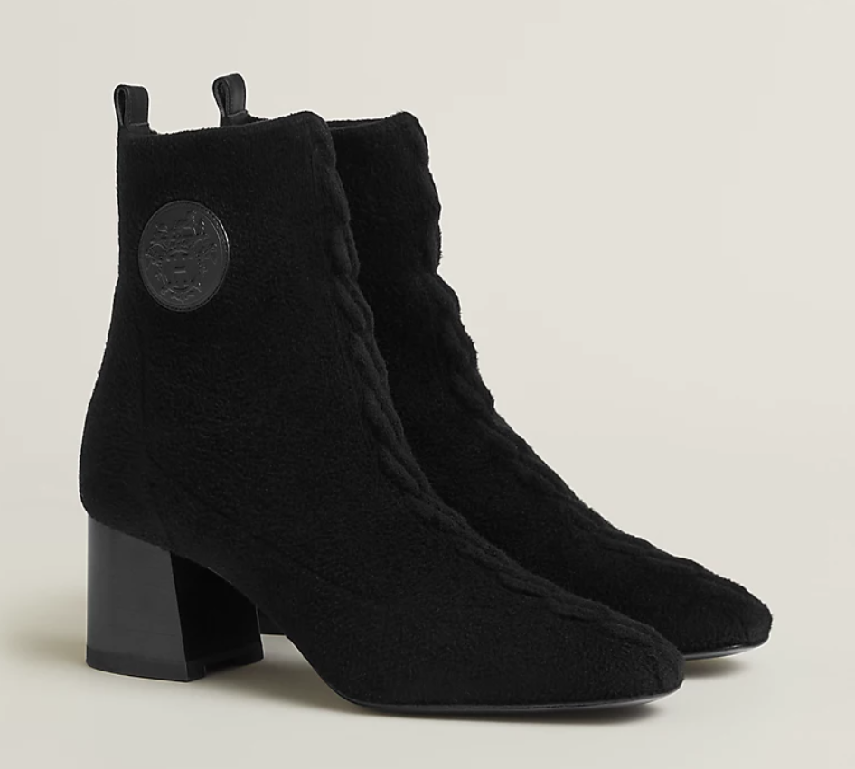 - 다음으로 소개해 드릴 제품은 에르메스 Volver 60 앵클부츠입니다. 보기만 해도 섹시함이 느껴지는 부츠인데요. 실제로 날렵한 쉐입과 이쁜 라인이 부츠를 더욱 도드라지게 만들어줍니다. 볼베르 블랙의 시크함을 제대로 느낄 수 있는 부츠인데요. 세부적으로 소재를 살펴보면 솔과 힐은 블랙 가죽, 인솔은 블랙 고트스킨, 안감은 블랙 테크니컬 캔버스로 되어 있습니다. 사진상으로 봤을 때는 굽이 상당히 있어 보여 불편한 것 아닌가 생각이 드실 수도 있는데 실제 굽은 6cm로 편하게 신으실 수 있습니다.